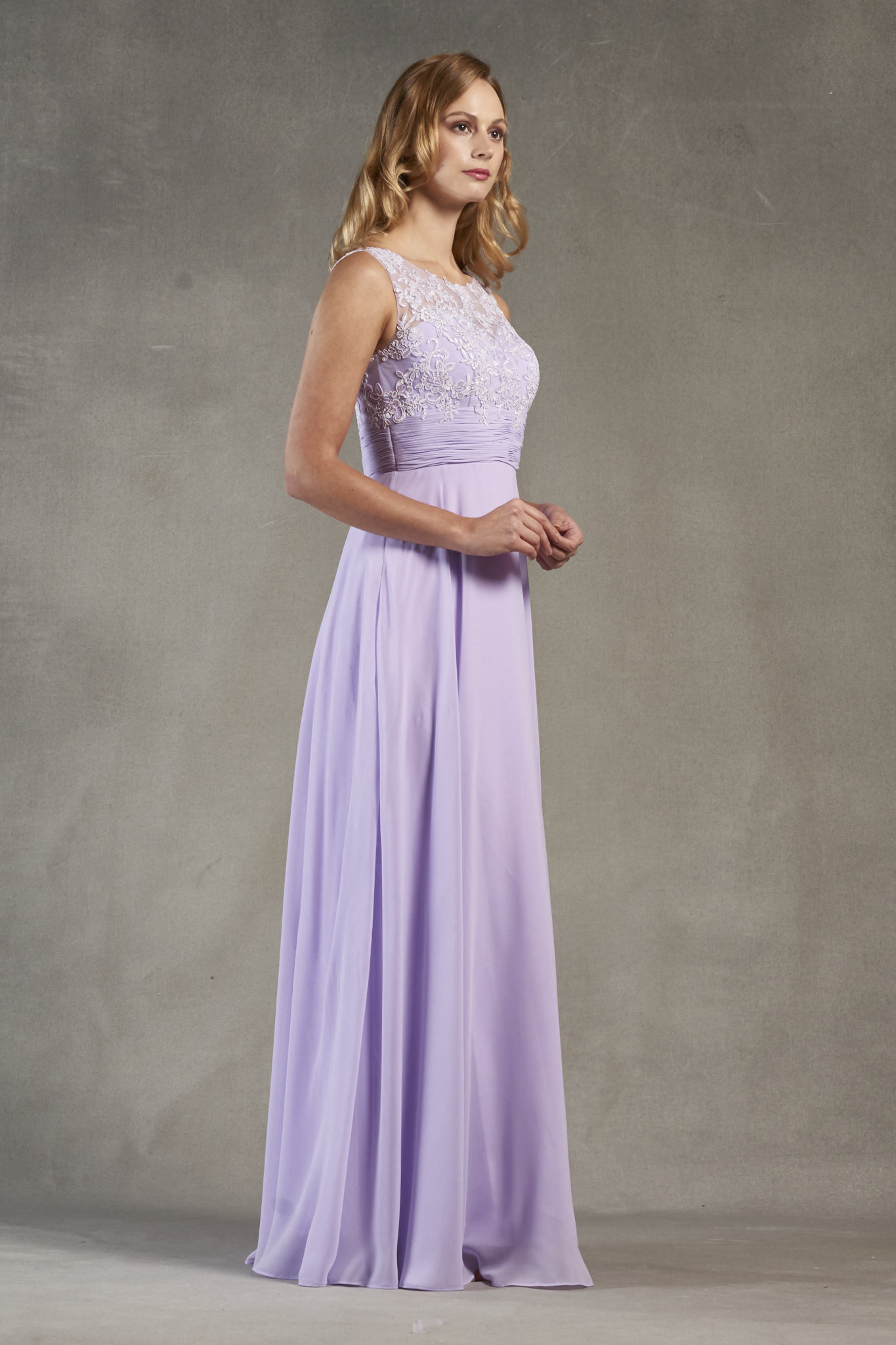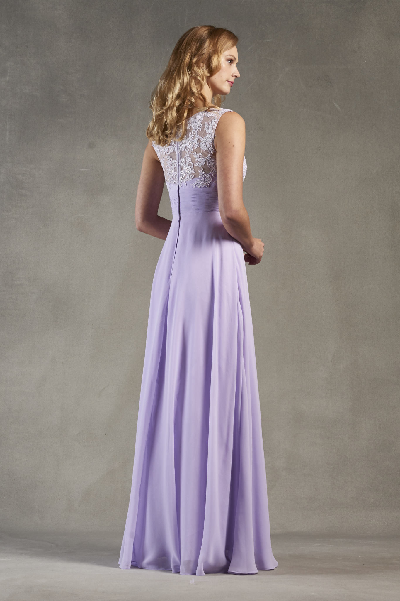 This sleeveless A-line evening dress is fashioned with soft chiffon and features a delicate lace-covered sweetheart under-bodice, a lace bateau neckline and softly pleated cummerbund waistline.