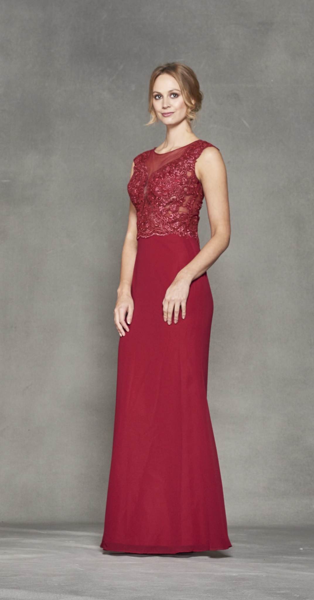 Indulge in timeless elegance with our floor-length fit and flare chiffon evening dress. The bateau neckline and delicate cap sleeves of the sheer bodice showcase lace applique, creating the illusion of a captivating plunging neckline and a deep V-back. This gown effortlessly combines sophistication and allure for a truly enchanting evening look.