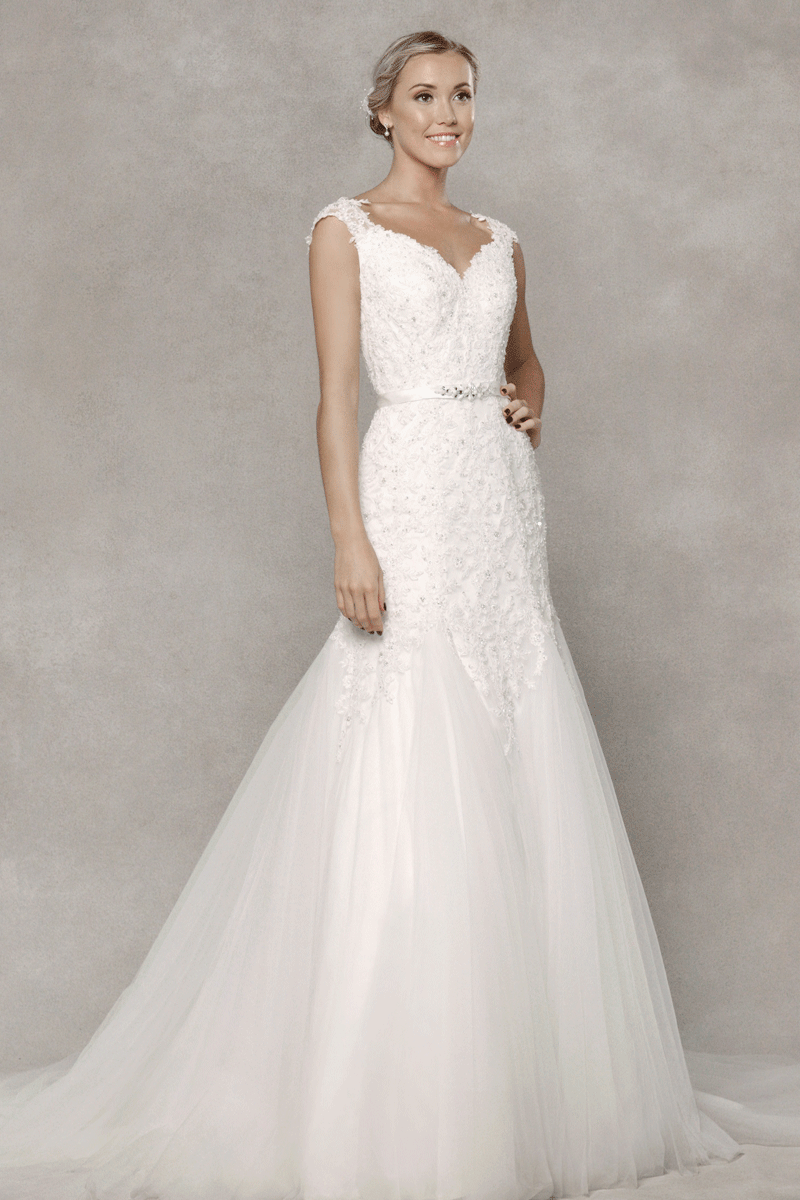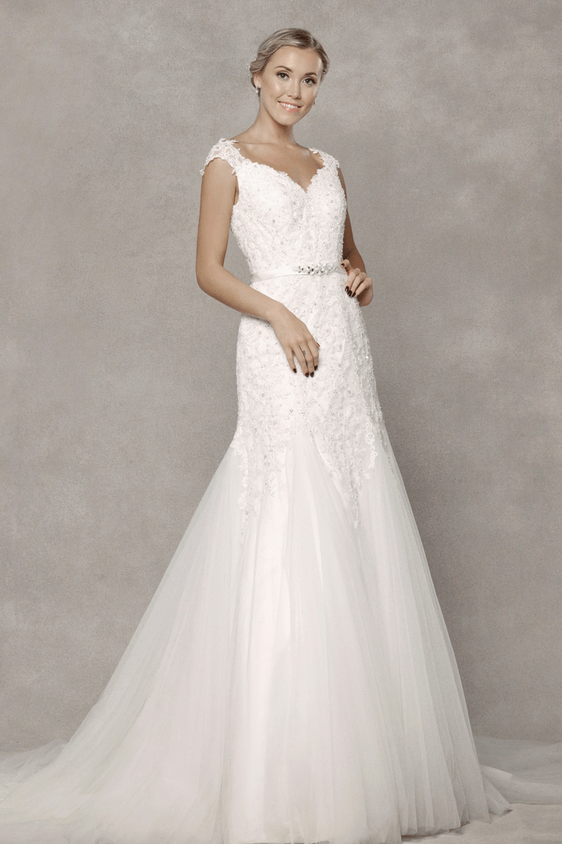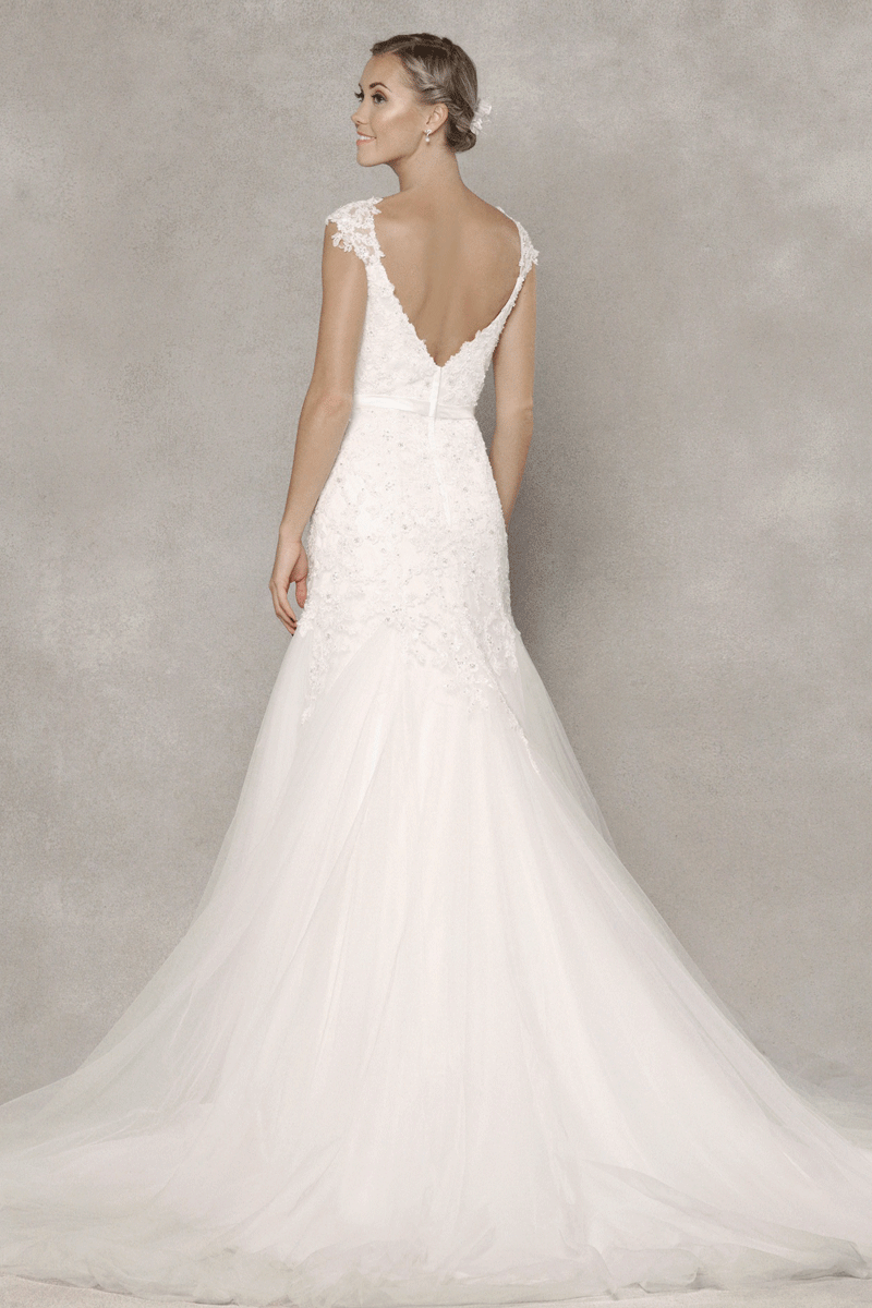 A stunning beaded cap sleeve gown that features exquisite beaded lace applique on the fitted torso and cinched at the waistline with a beautifully beaded satin band. The romantic Queen Anne neckline and feminine open V-back has a zip closure and sweeping chapel train.