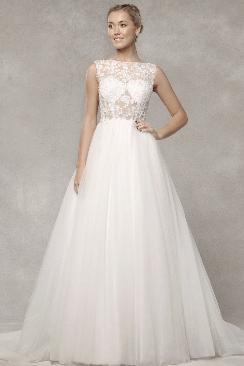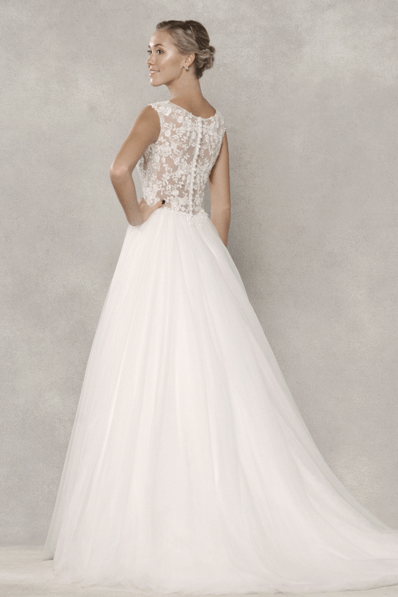 Elevate your bridal style with our enchanting bridal dress featuring a delicately crafted sheer lace bodice and a flattering fitted A-line silhouette. The sleeveless design adds a touch of modern sophistication, while the sheer lace back adorned with elegant buttons creates a timeless and romantic allure. This dress is a perfect choice for brides seeking a harmonious blend of contemporary elegance and classic charm on their special day.
