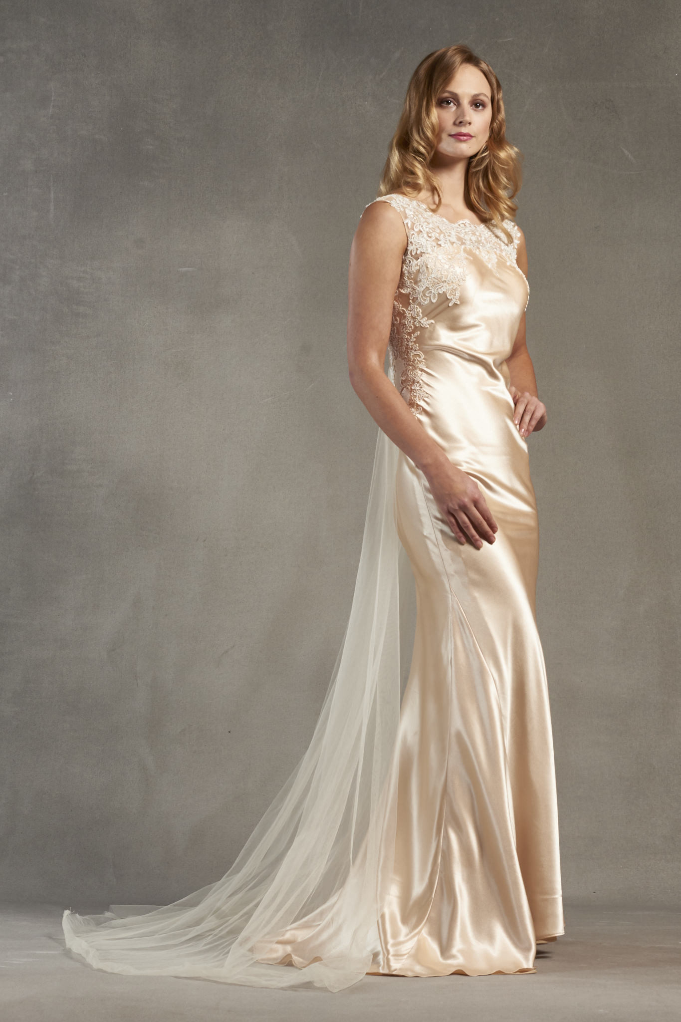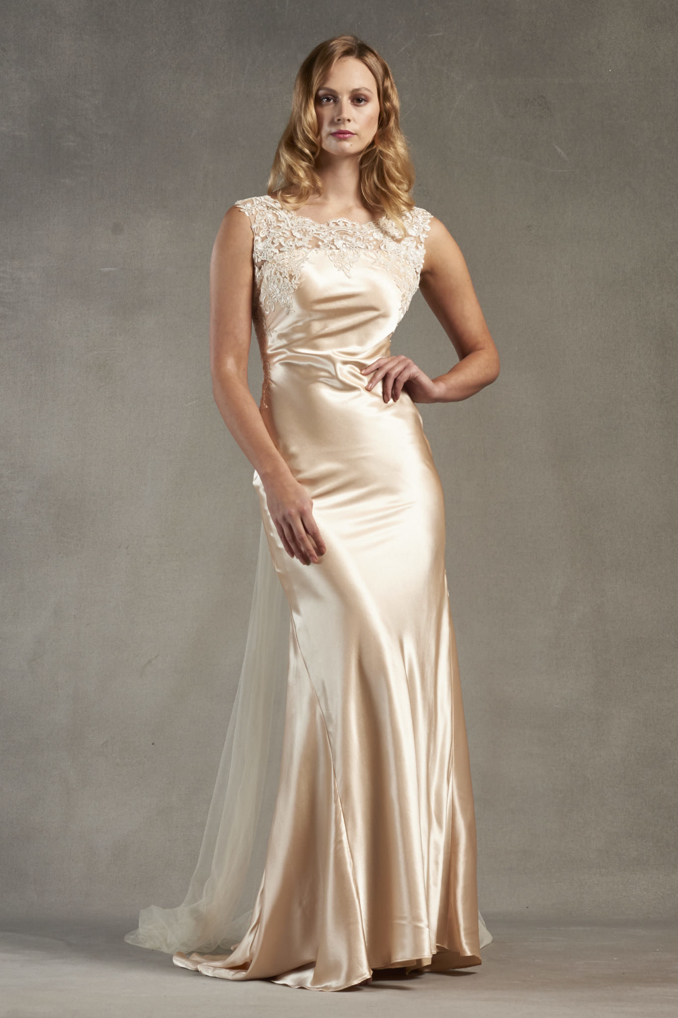 Indulge in elegance with our backless satin fit and flare evening dress featuring a soft tulle panel train. The bateau neckline adorned with delicate lace extends seamlessly from the cap sleeves down the side of the bustline, adding a touch of romance to your sophisticated look.