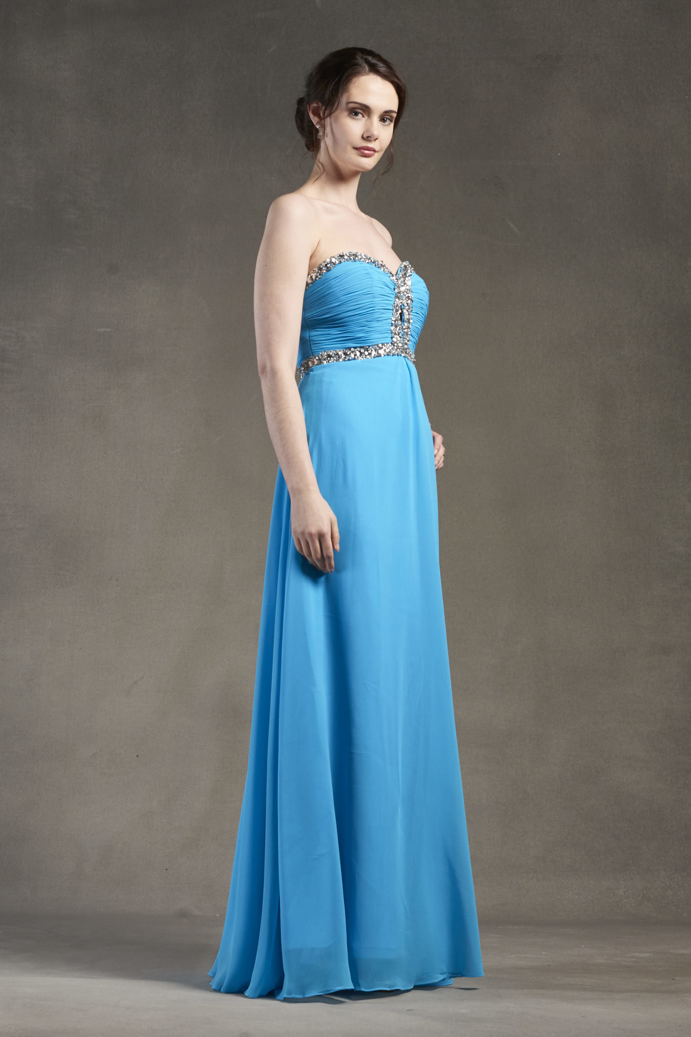 A stunning strapless floor-length chiffon evening dress, featuring a softly pleated sweetheart bodice with cut-out detail at the front and edged with sequins and diamante at the waist and neckline.