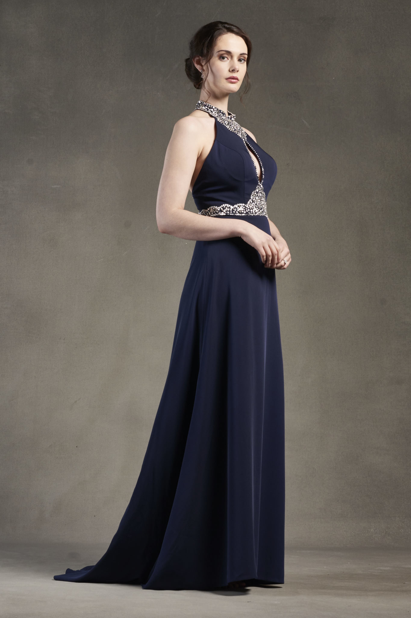 Jersey open-back fit and flare halter neck evening dress with a chapel train. The front of the bodice features a vertical slit and the neck, waist, and back detail are heavily beaded for evening glamour.