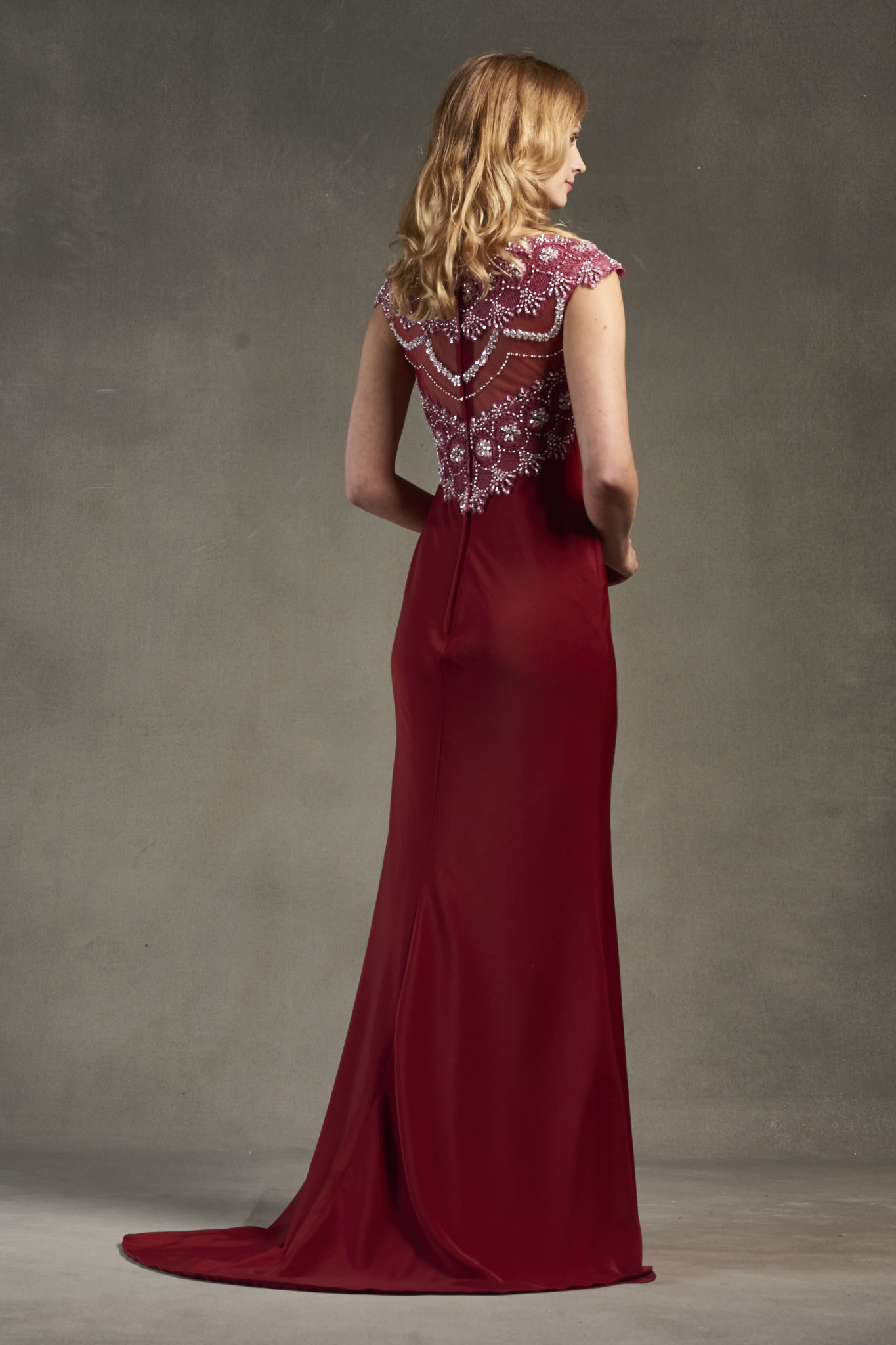 A jersey fit and flare evening dress with sheer lace back and cap sleeves, beaded belt detail under the bustline, and a small flowing train.