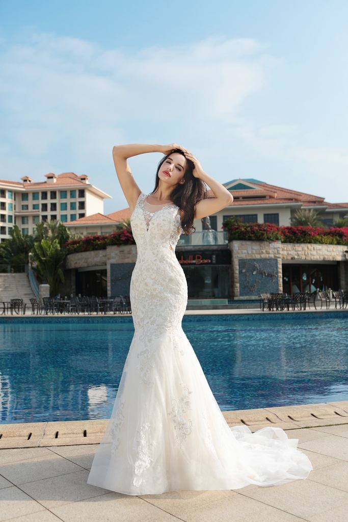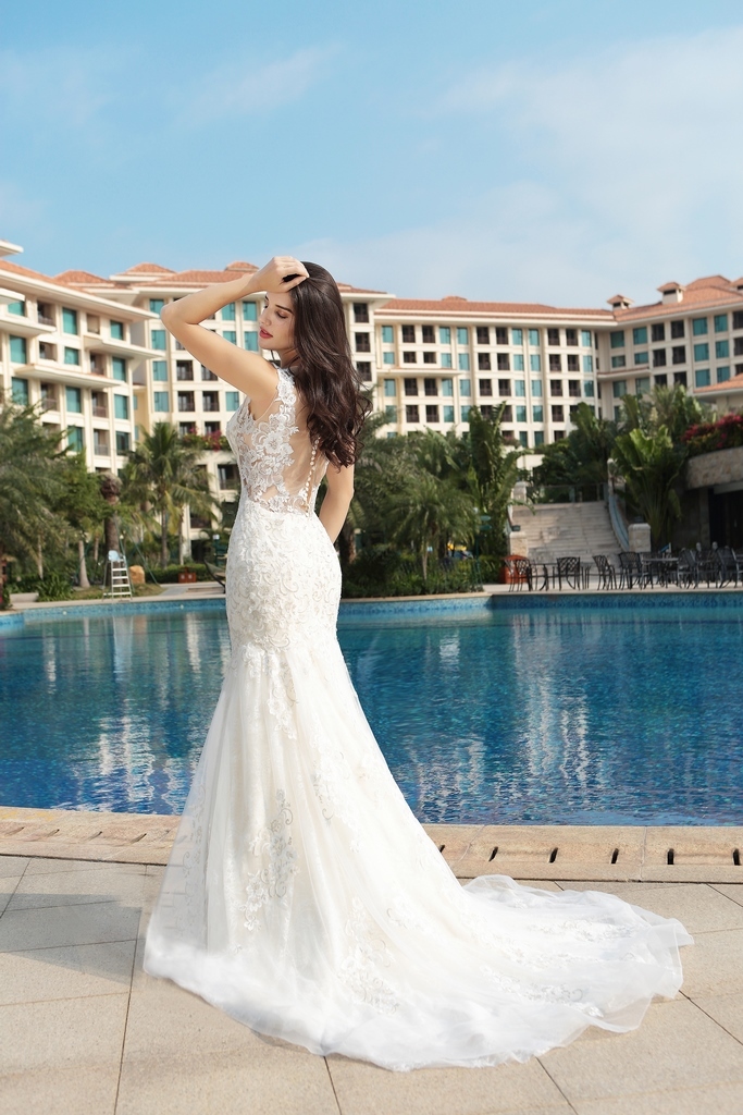 Elevate your bridal elegance with our enchanting bridal gown adorned in exquisite lace appliqué detailing that graces every inch of this timeless piece. The sheer deep V-neckline adds a touch of allure, while the graceful mermaid fit ensures a stunning silhouette that accentuates your curves with sophistication. In classic white, this gown embodies timeless beauty, creating a perfect harmony of romance and modern chic for your special day.