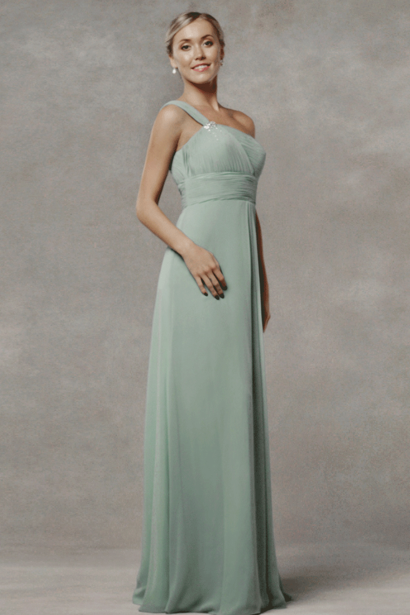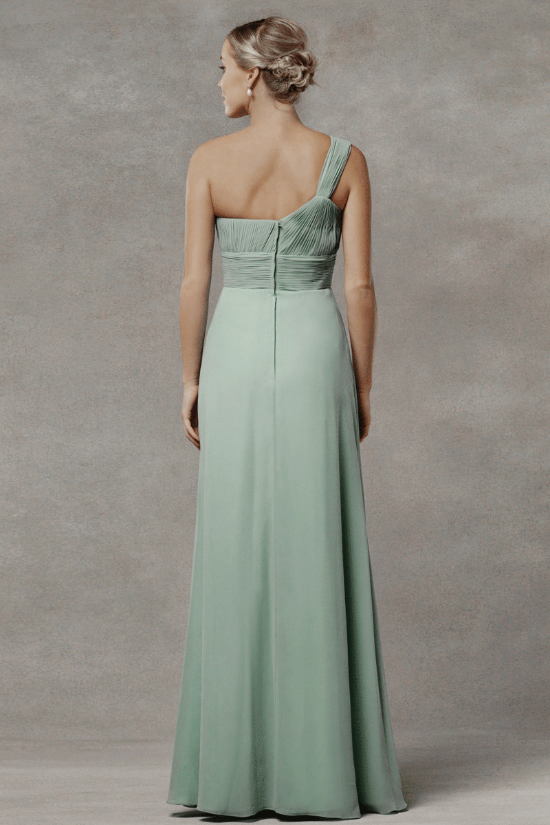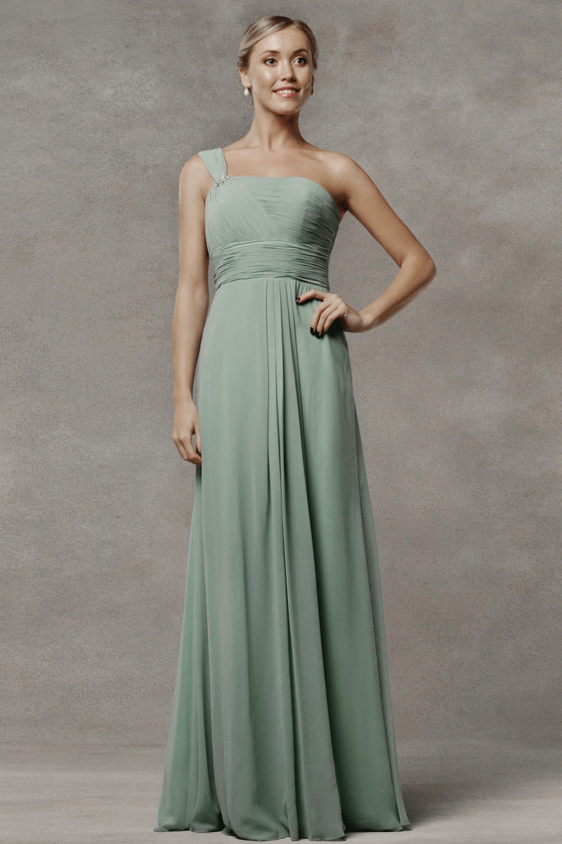 Step into sophistication with our exquisite evening dress. This elegant ensemble features a graceful one-shoulder strap and delicate pleated chiffon, adorned with intricate beaded detailing for a touch of glamour. The strategically ruched under-bust band enhances your silhouette, creating a stunning slimming effect that complements the timeless beauty of this captivating gown.