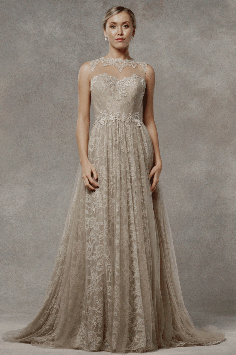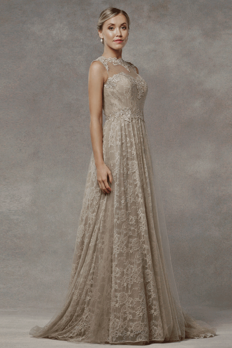 Romantic, sleeveless, soft tulle and lace evening dress with a sheer bateau neckline and back, finished with lace applique, and a fitted sweetheart bodice. The waistline features stunning lace detailing, and soft gathers lead into an A-line skirt with a chapel train.