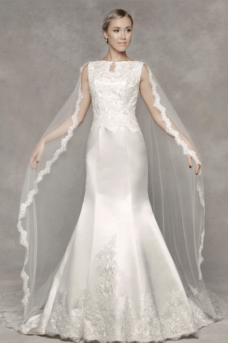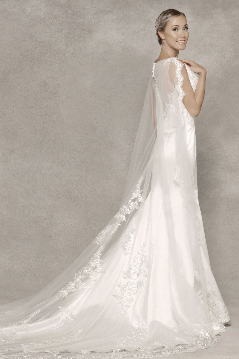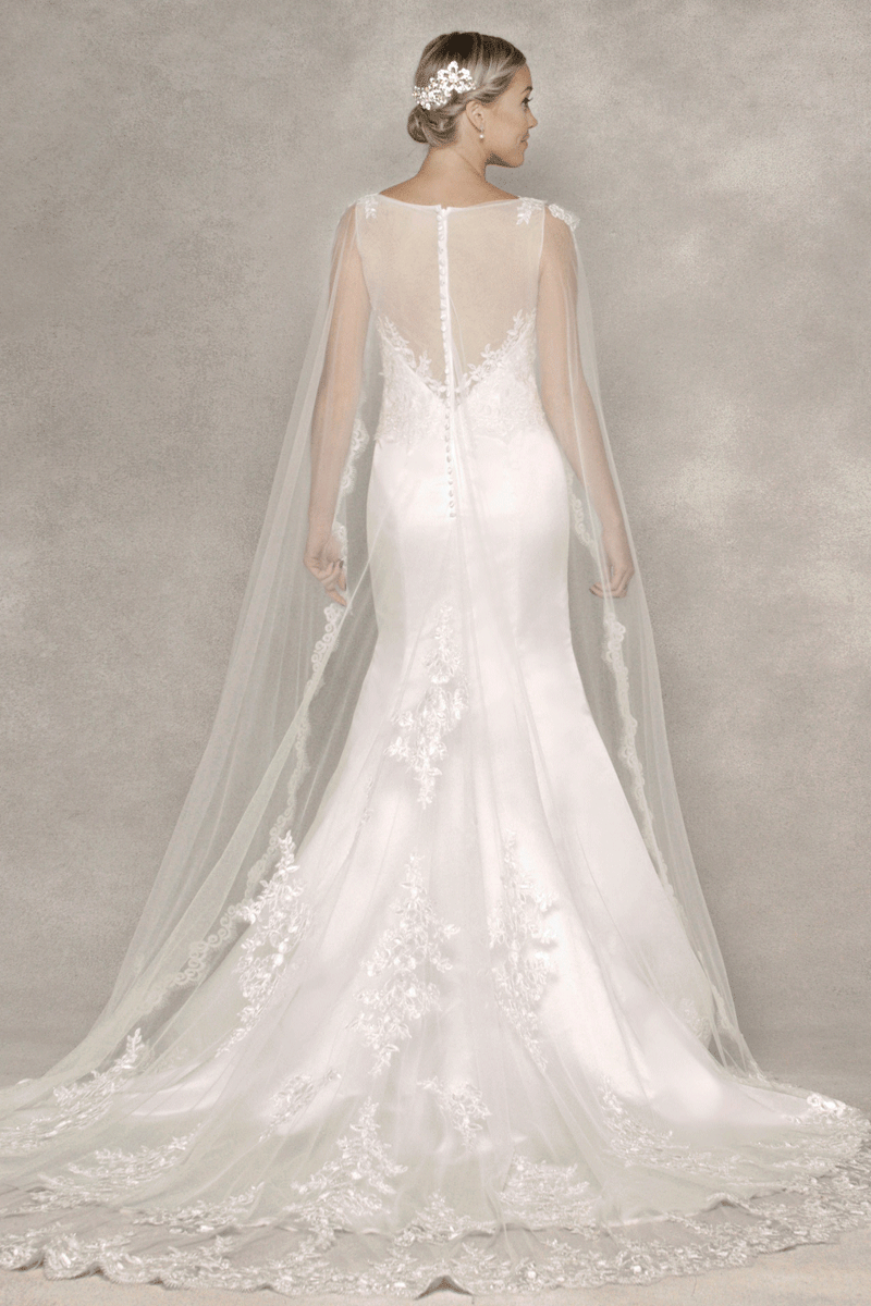 A glossy, vintage charmeuse fit and flare gown with a stylish keyhole centred in the high bateau neckline. Featuring an exquisite illusion back with zip and button closure and the full length shawl is embellished with scalloped lace trim creating an exquisite silhouette.