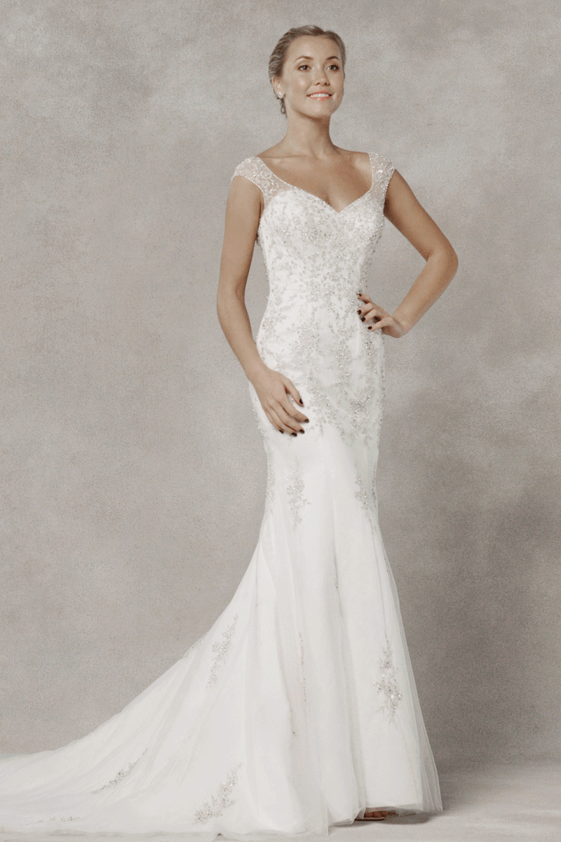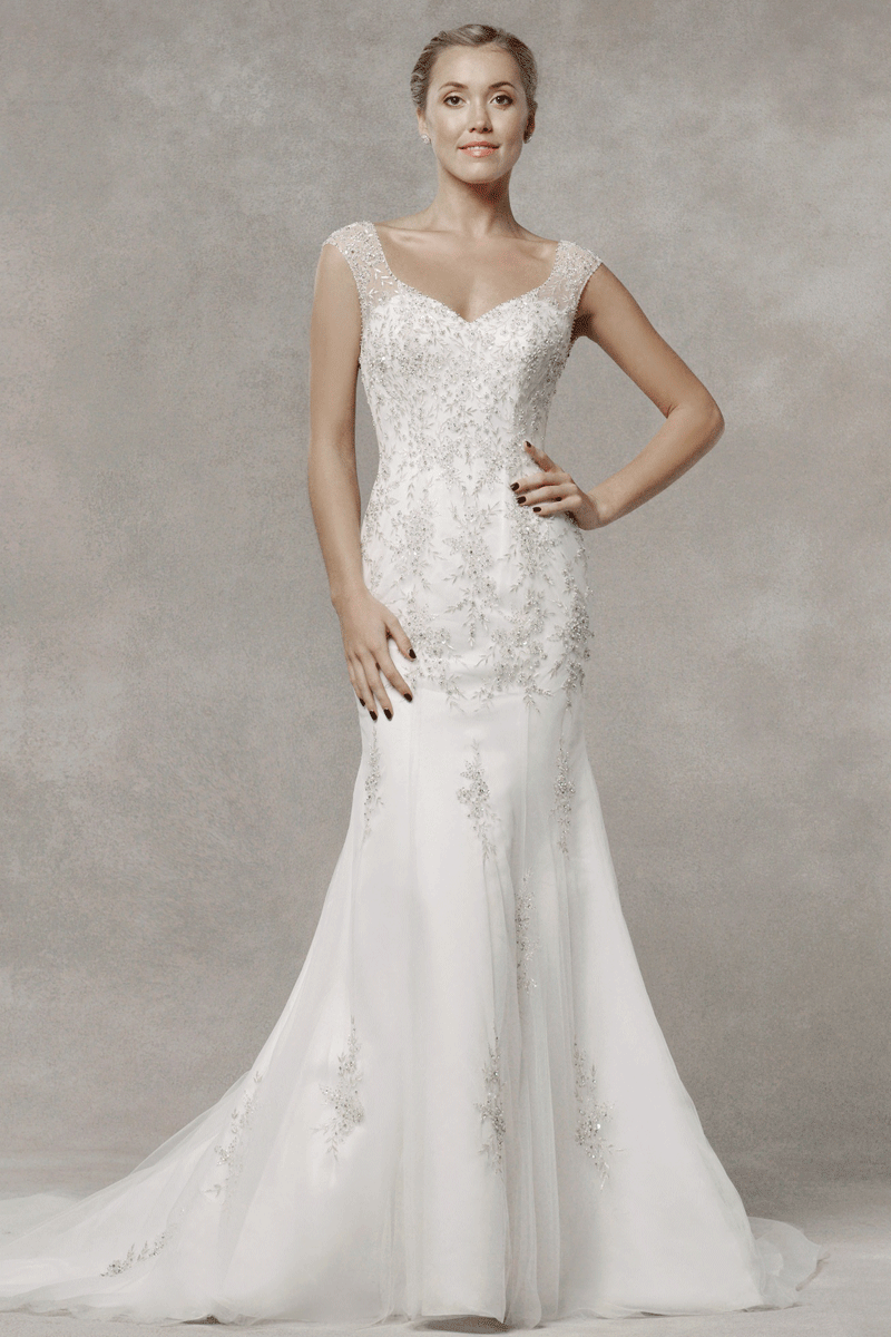 Elevate your bridal elegance with our exquisite bridal dress featuring delicate cap sleeves, adorned with intricate crystal-beaded embroidery that glistens with every movement. The sweetheart neckline and low back create a romantic silhouette, while the mermaid cut accentuates your curves. The full-length tulle skirt with a trailing train adds a touch of drama, ensuring you make a stunning entrance on your special day.
