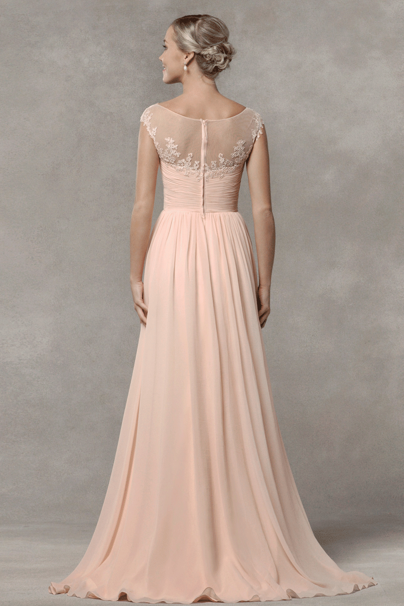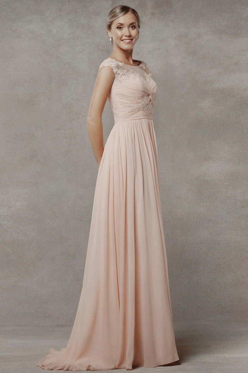 Step into timeless elegance with our enchanting bridal dress. This full-length gown features a sleeveless design crafted from luxurious chiffon, adorned with an intricate illusion tulle lace bodice and back for a touch of ethereal romance. The figure-flattering silhouette is accentuated by a slimming ruched waist cummerbund, ensuring you radiate grace and sophistication on your special day.