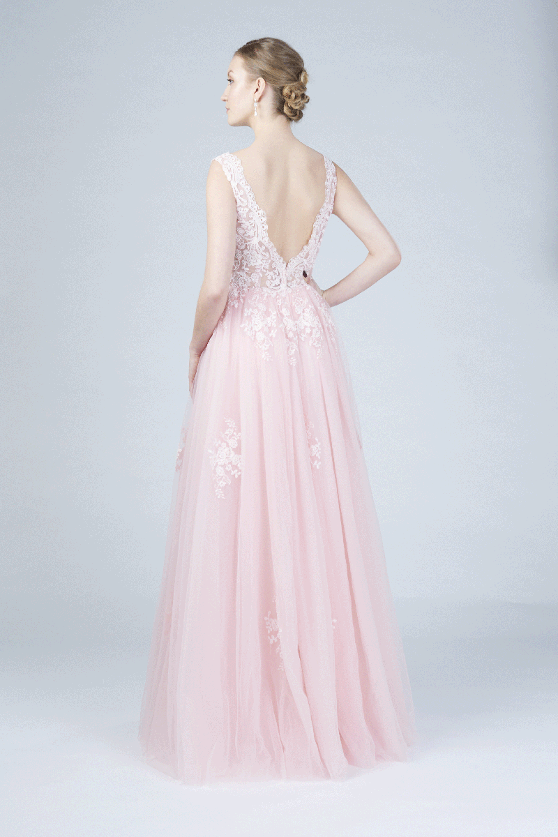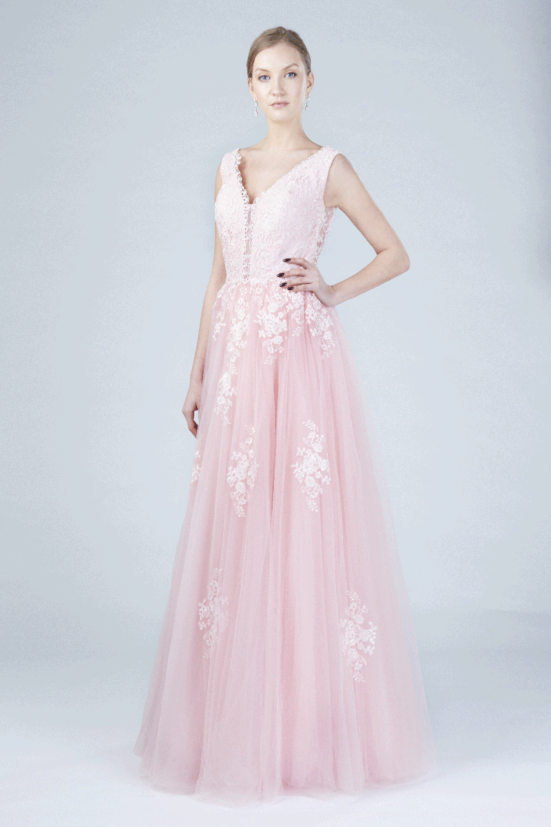 Elevate your evening elegance with our enchanting A-line evening dress—a breathtaking fusion of modern allure and timeless romance. Adorned with meticulously crafted embroidered lace appliques, this gown effortlessly captivates, while the deep V-neckline adds a touch of sophistication, making it the perfect choice for a memorable night of glamour and grace. Embrace a silhouette that celebrates your unique style and creates an unforgettable impression at any special occasion.