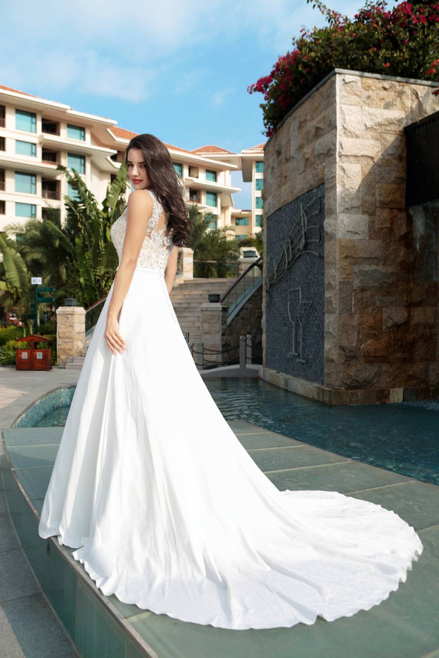 Chiffon and sheer lace combine to create this stunning bridal gown with a flattering fit and flare skirt. The dress is sleeveless with a beautiful lace embellished bodice and neckline and a sheer lace back with button detail over a zip closure.