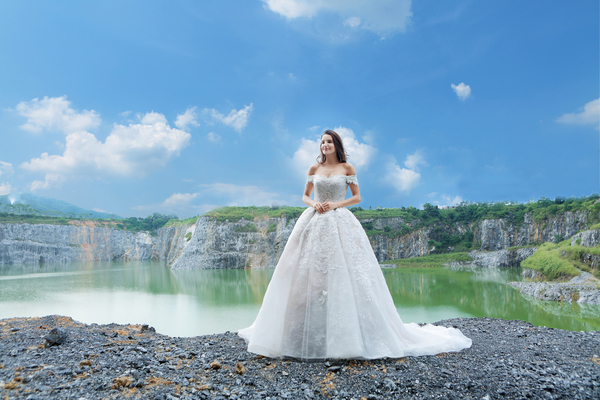 Embrace the princess within with this enchanting gown, featuring a fitted lace bodice, stylish off the shoulder straps, and soft tulle skirt embellished with lace. The dress is finished with a gorgeous V-back and a traditional button close.