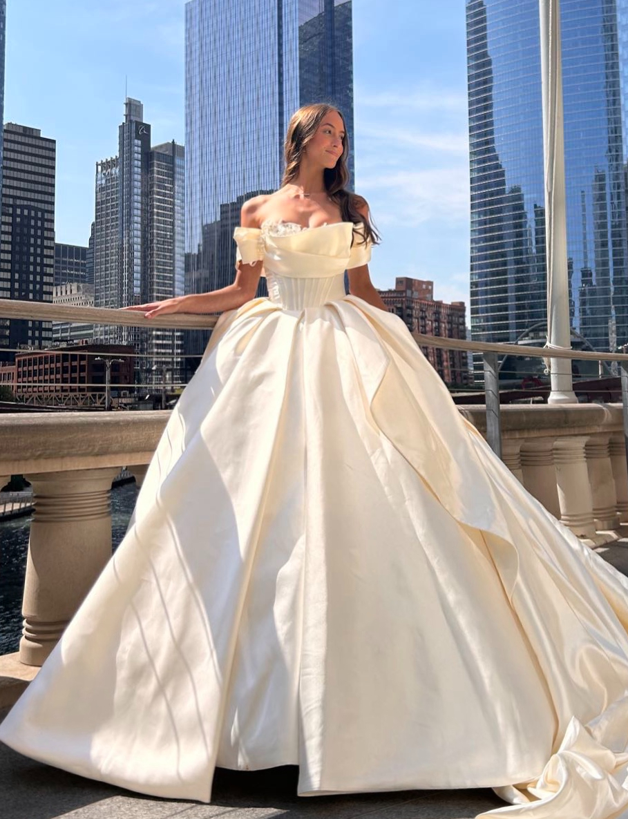 Turn heads in this exquisite mikado white bridal gown, featuring a stunning floral pattern on the sheer bodice for a romantic touch. The off-shoulder straps add elegance, while the voluminous skirt with a sweeping train creates a dramatic, fairy tale silhouette. Perfect for the bride who dreams of timeless sophistication and grandeur.