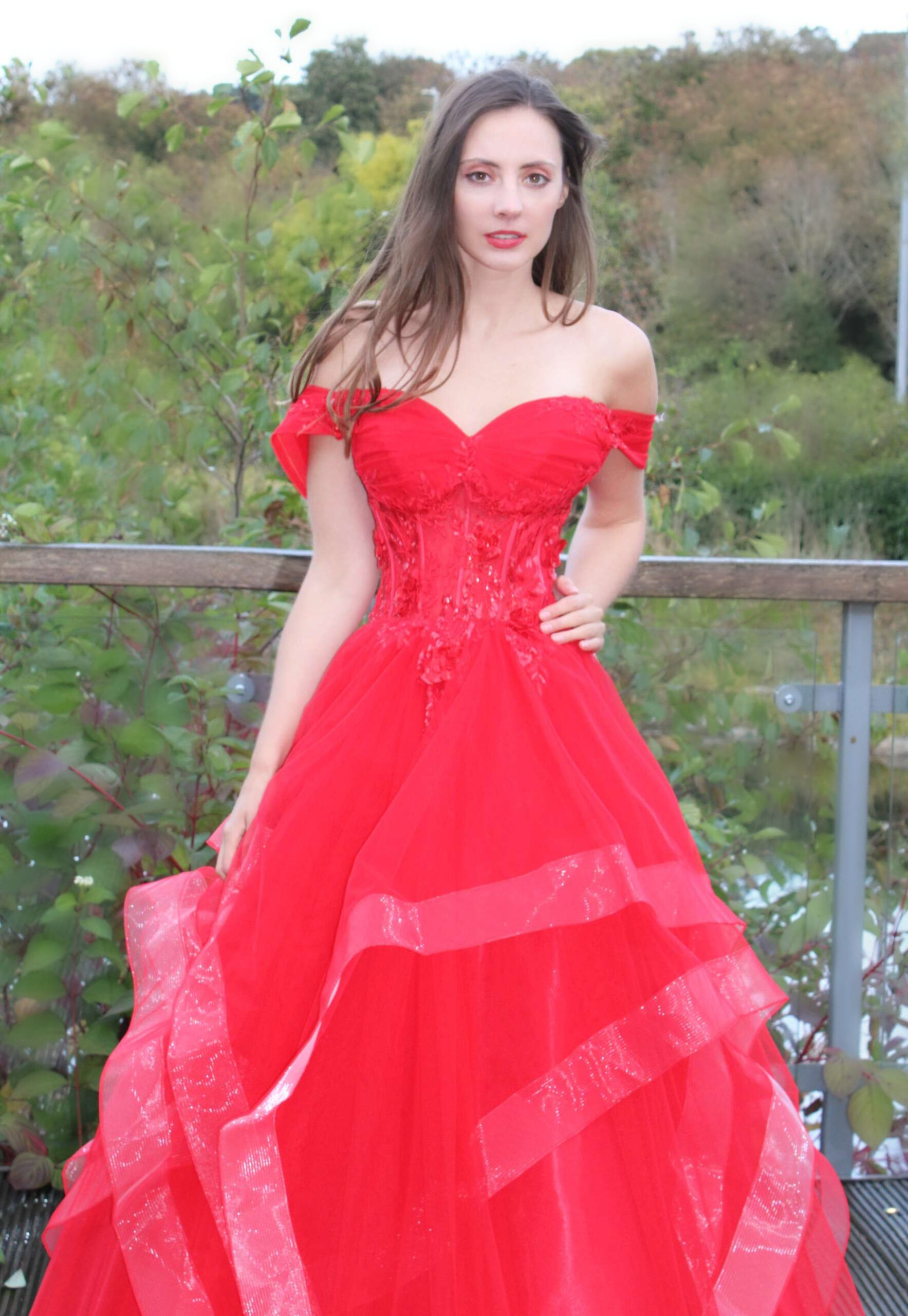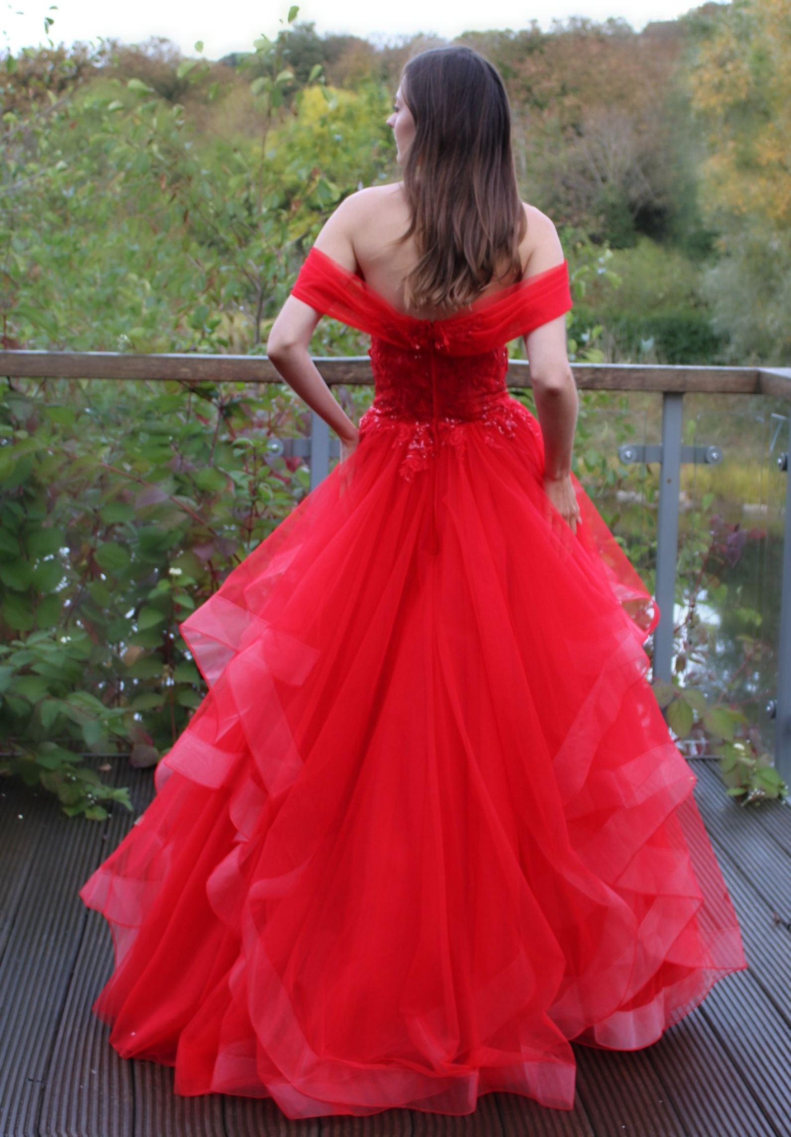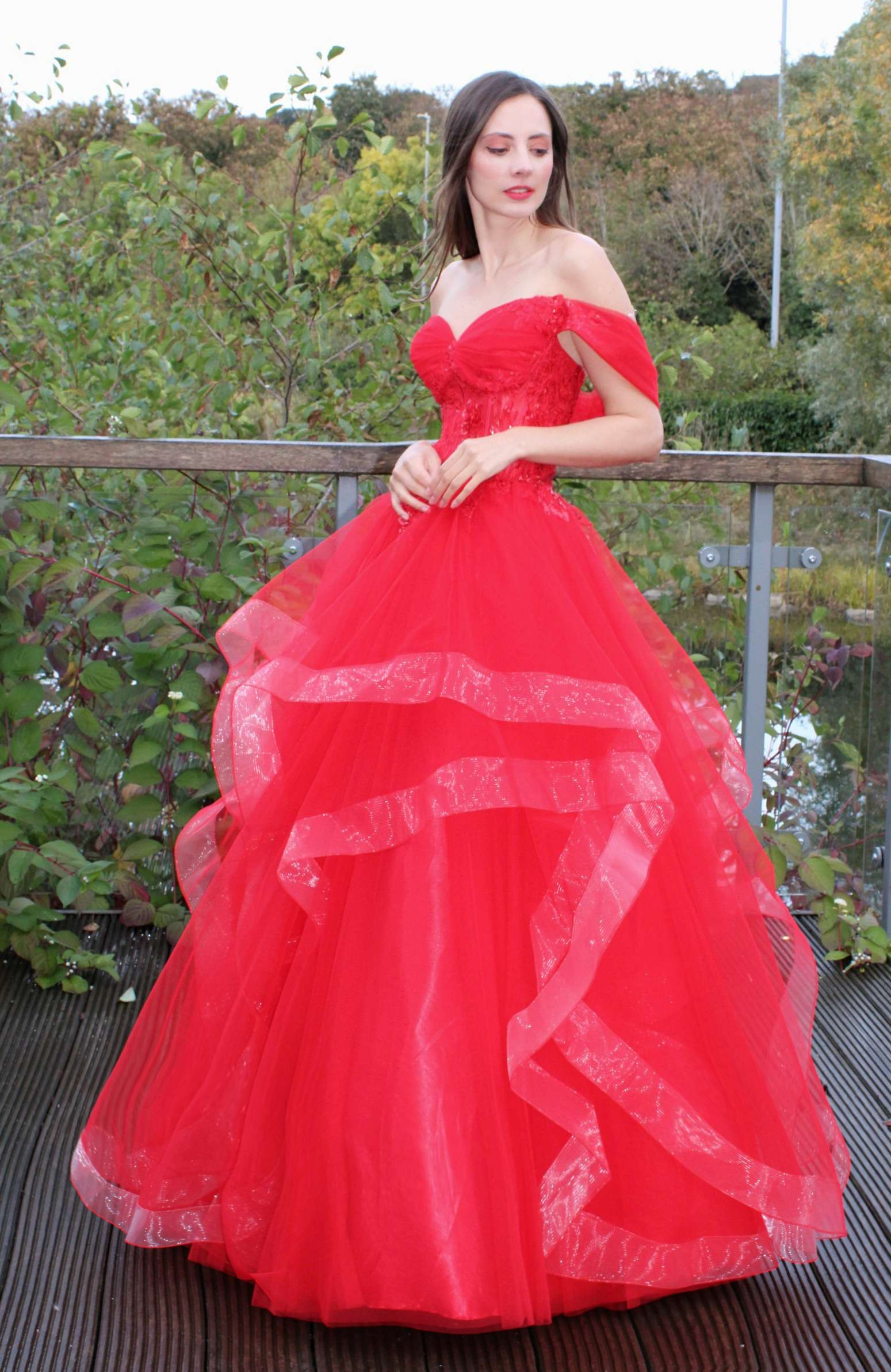 Elevate your prom night style with our stunning red prom dress crafted from luxurious tulle fabric. The dress features intricate sequin detailing that adds a touch of sparkle, making you shine like a star on your special evening. The off-shoulder straps showcase your collarbones elegantly, while the zipper closure ensures a perfect fit. The dress boasts a playful ruffled pattern that adds a fun and flirty vibe, making it a standout choice for any prom or formal event. Make a statement and turn heads as you dance the night away in this enchanting red prom dress.