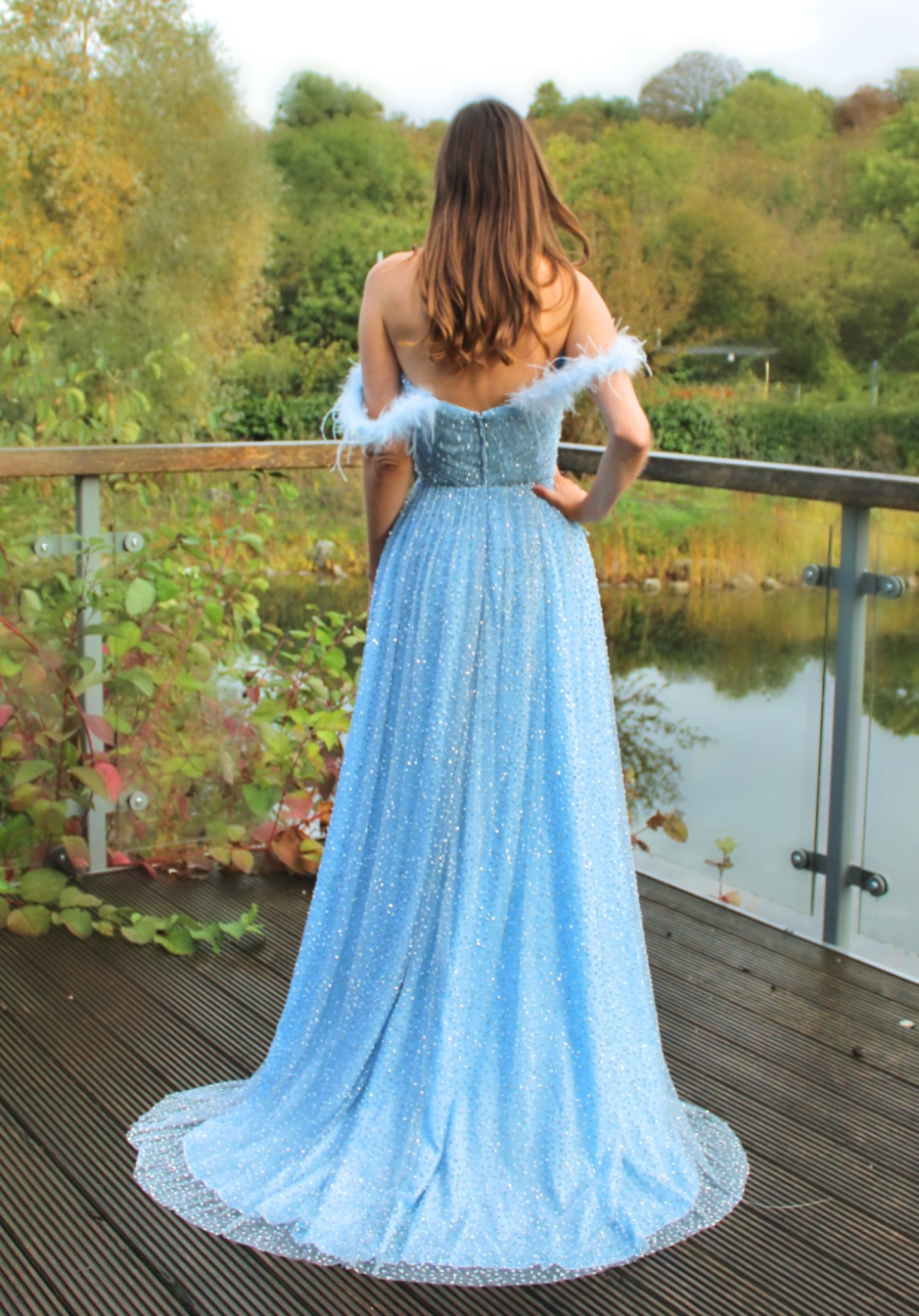 Introducing our exquisite Sky Blue Prom Dress and Bridesmaid Dress, a harmonious blend of elegance and glamour. Crafted from luxurious glitter mesh fabric, this dress shimmers and catches the light with every movement, making you the center of attention at any event. The dress features fur sleeves, adding a touch of sophistication. With its enchanting sky blue hue, this dress is a perfect choice for prom night, bridesmaids, or any special occasion where you want to make a lasting impression. Step into the spotlight and radiate confidence in this enchanting attire, designed to make you look and feel like a true star.
